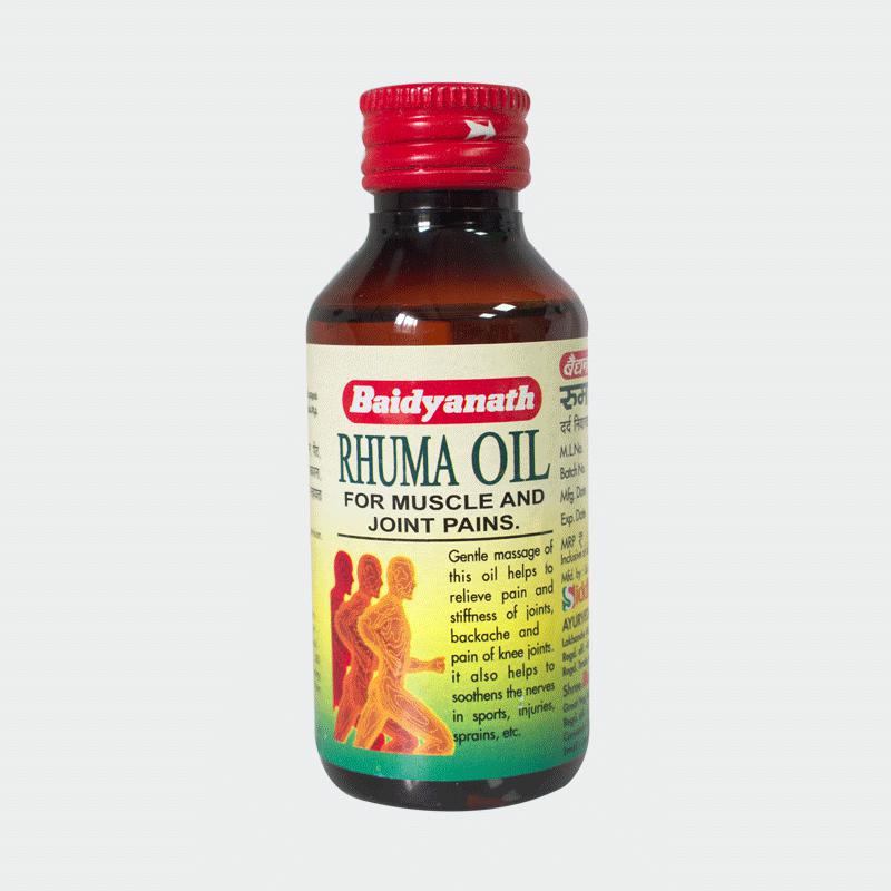 Rhuma oil by Baidyanath is an ayurvedic pain oil for musculoskeletal pains. Indication: Gentle massage of this oil helps to relieve pain and stiffness of joints, backache and pain of knee joints, it also helps soothens the nerves in sports, injuris, sprains etc Dosage: Gently massage on affected joint or area.