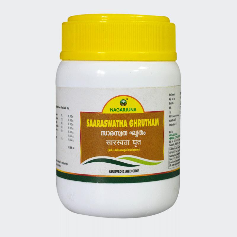 SARASWATHA GHRUTHAM?by?NAGARJUNA?is an ayurvedic classical ghee preparation processed with many herbs which are memory boosters as well enhances the brain functions